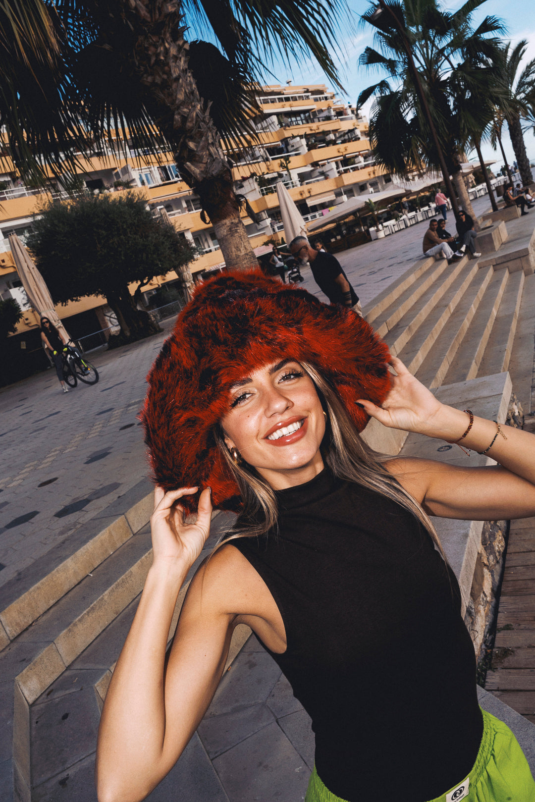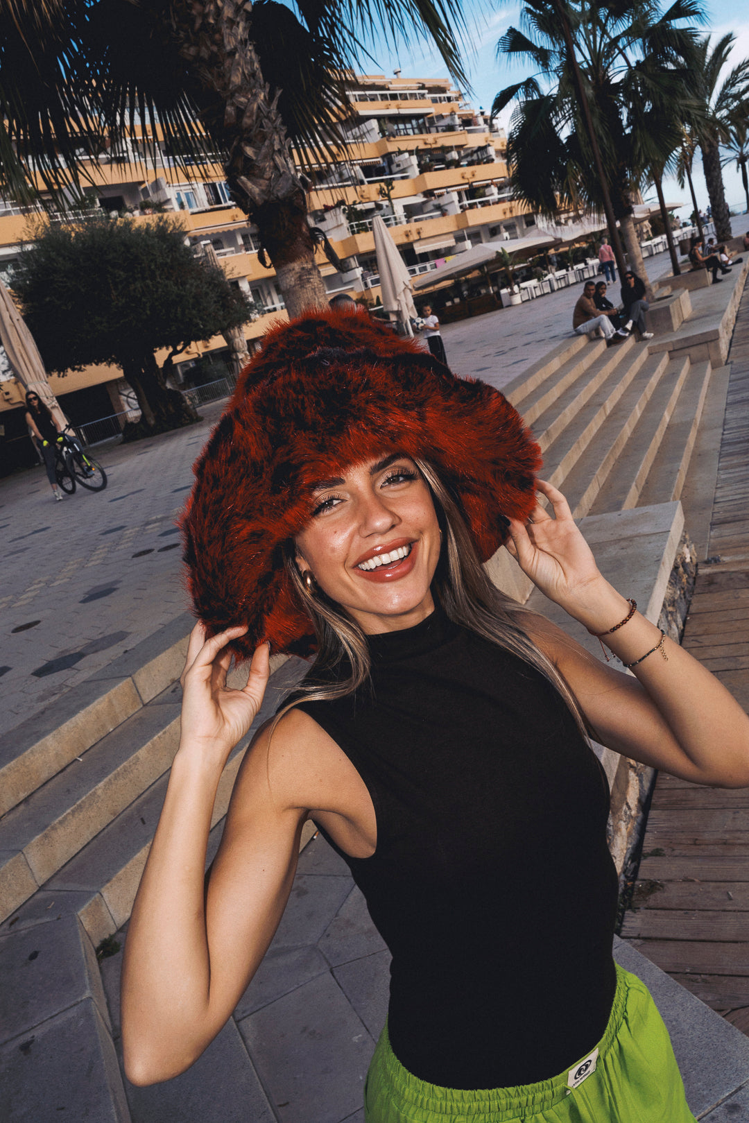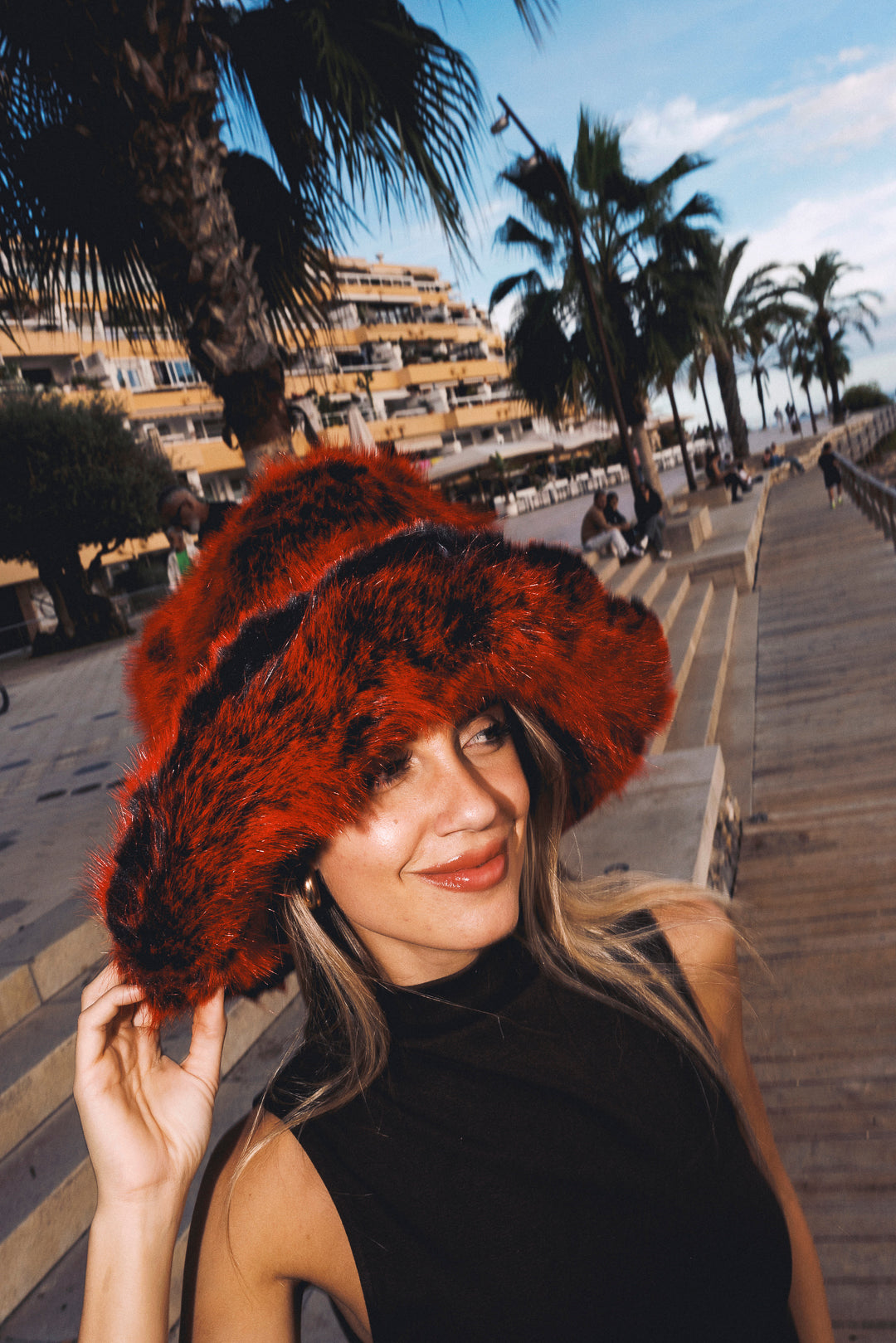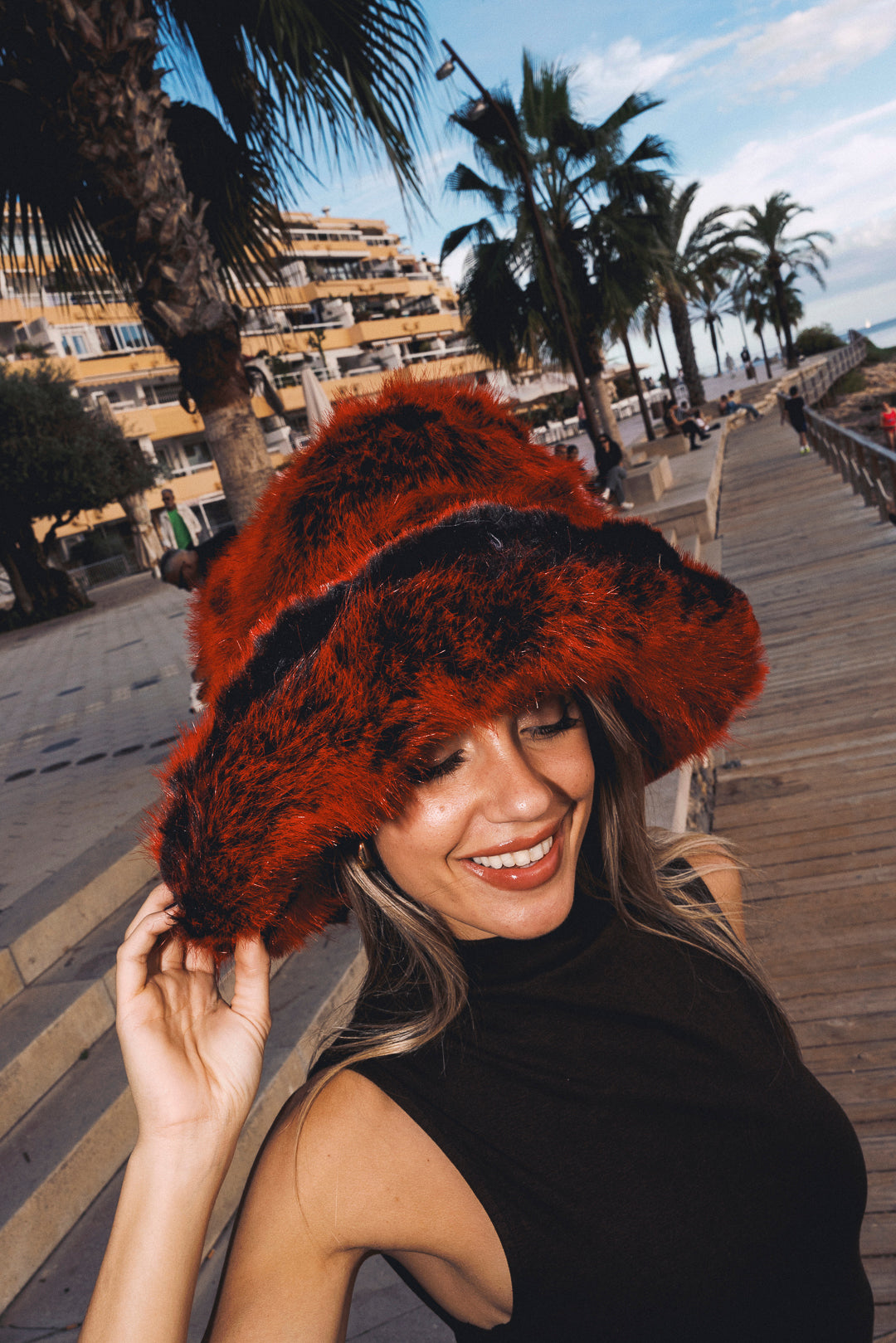 Faux fur hat. Uber fluffy and mega floofy bucket hat in lux red and black coloured fur. OOTO are campaigning to see fields of fluffy heads and fuzzy hearts this festival season...