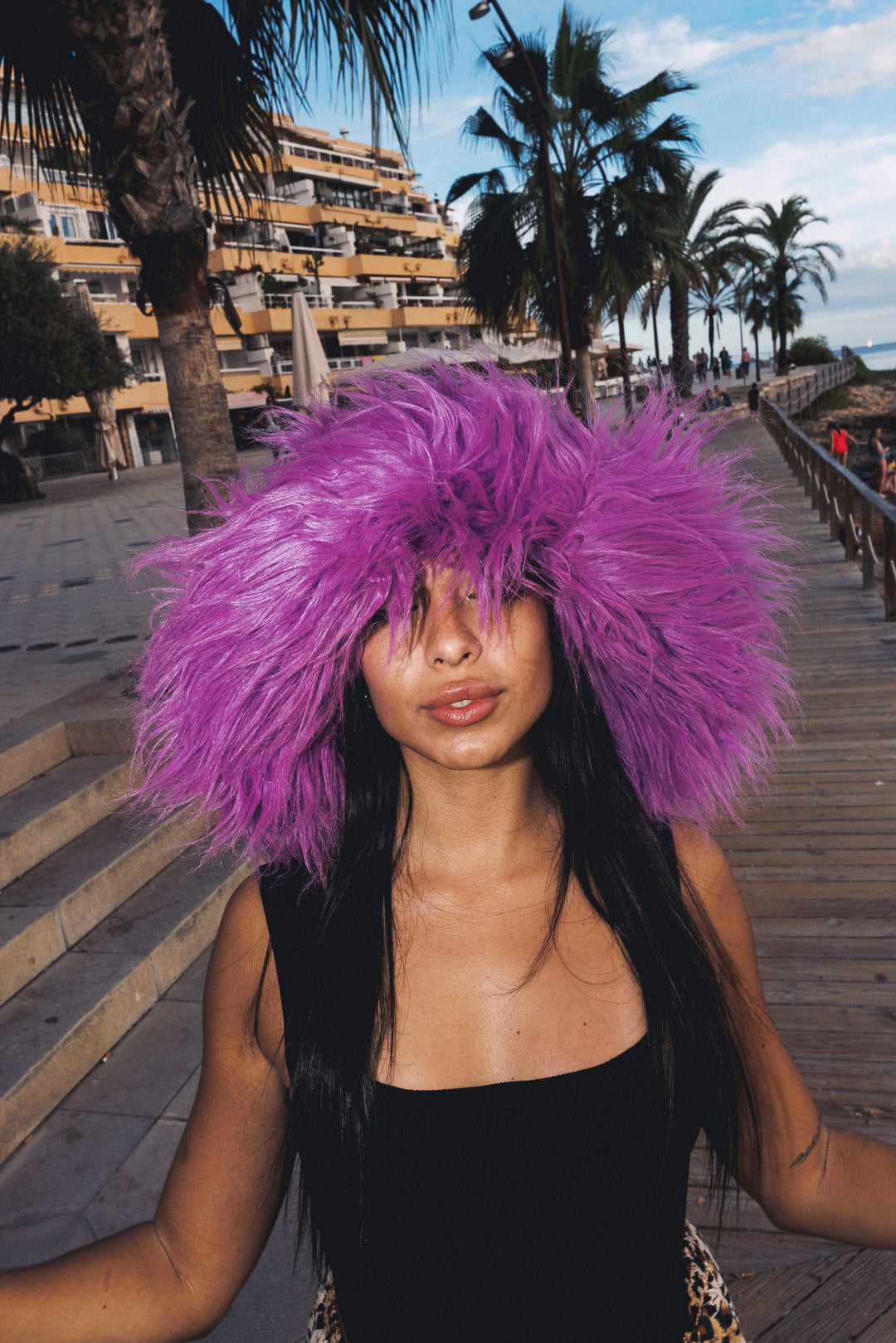 Faux fur hat. Uber shaggy and mega floofy bucket hat in lilac. OOTO are campaigning to see fields of fluffy heads and fuzzy hearts this festival season...